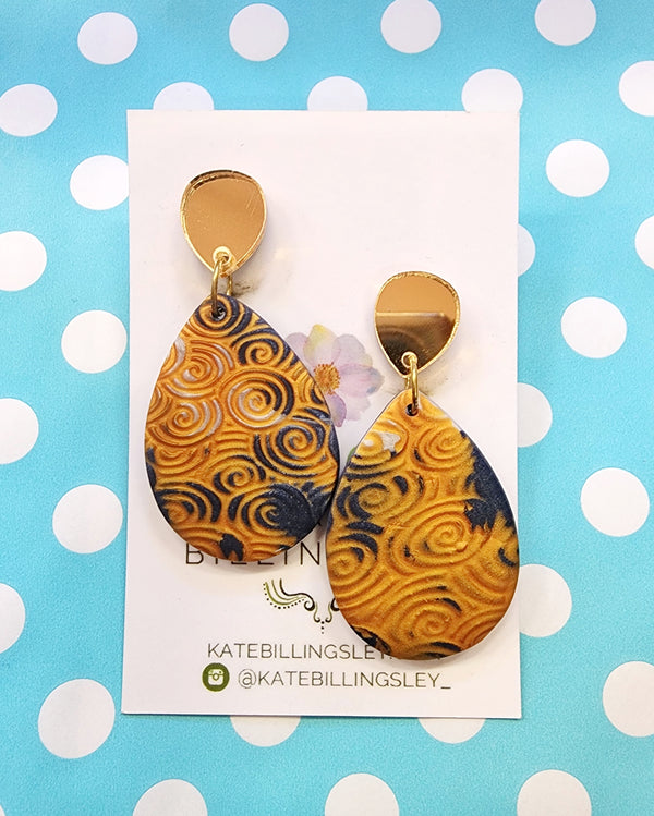 Navy Gold Ripple Teardrop Medium Designer Dangles - Polymer Clay